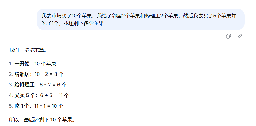有些进阶场景下,比如求解某些数学题,少样本提示也并不足以让大模型推理出正确结果。下面是提问一道简单的数学题:【我去市场买了10个苹果,我给了邻居2个苹果和修理工2个苹果,然后我去买了5个苹果并吃了1个,我还剩下多少苹果?】